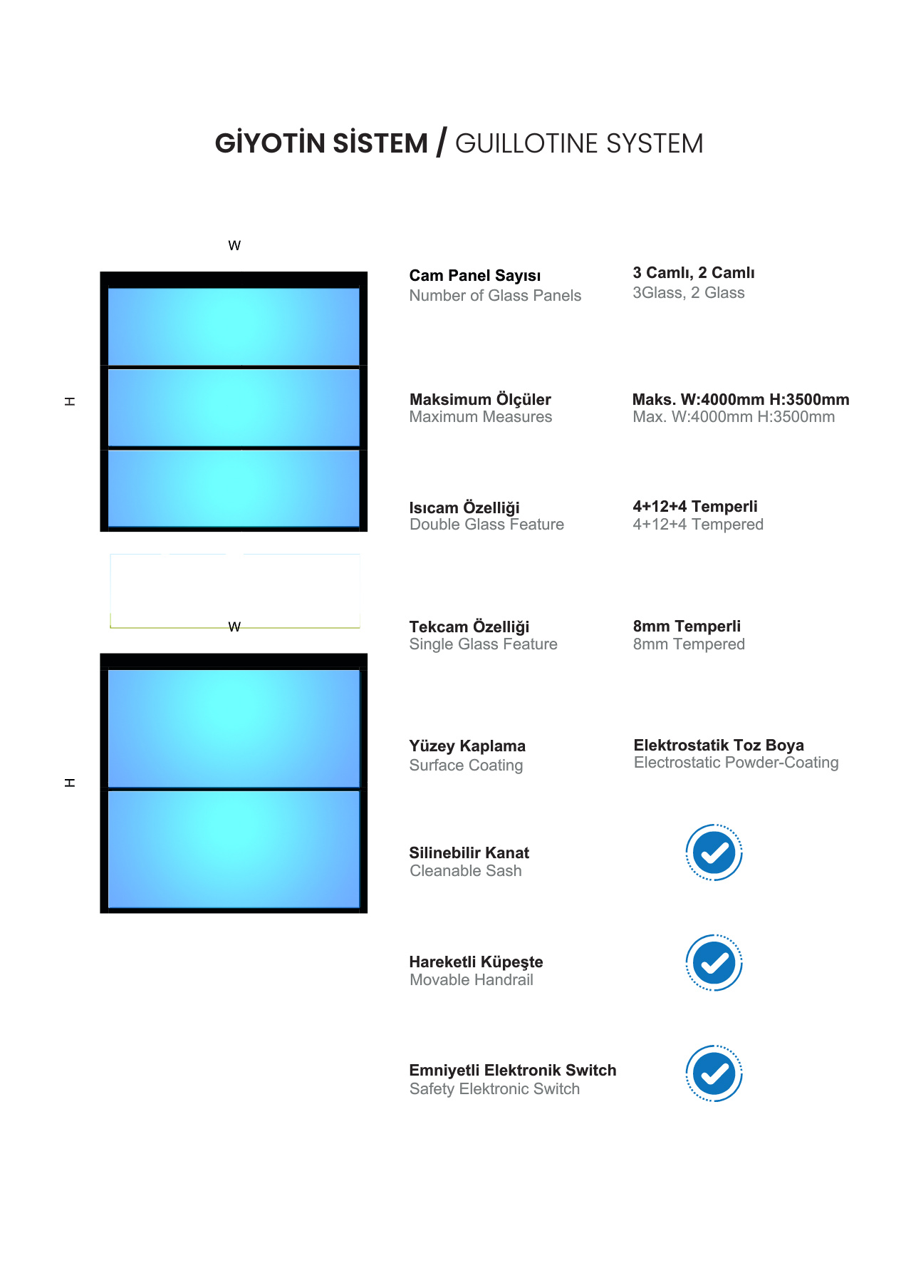 8 mm temperli veya ısıcam panellerden oluşan giyotin sistemleri, yukarı-aşağı hareketiyle doğal ışık ve panoramik görüş sunar. RTS teknolojisine sahip motor sistemi, uzaktan kumanda ile yönetilebilir. İnce ve estetik cam profilleri, görüş alanını engellemez; sınırsız renk, ahşap kaplama ve desen seçenekleri ile dış mekânla uyumlu bir görünüm sağlar.